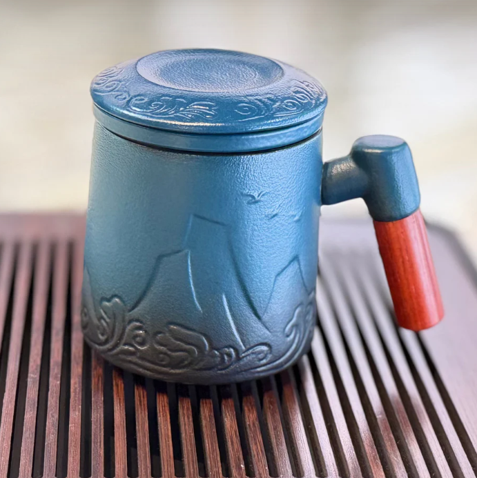 Ceramic Tea Mug with Lid, Infuser, and Wooden Handle - 12oz