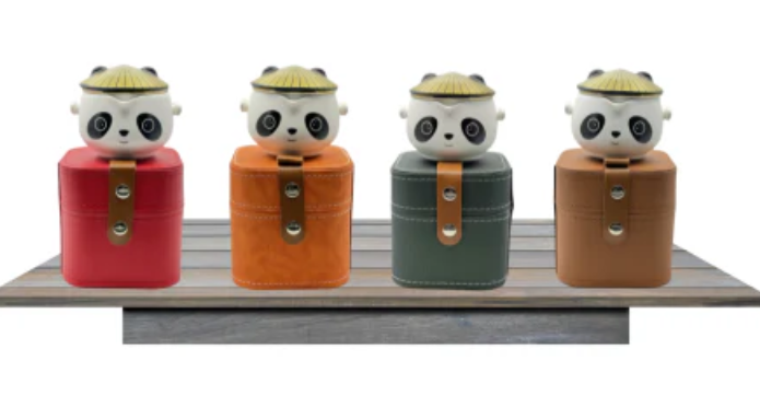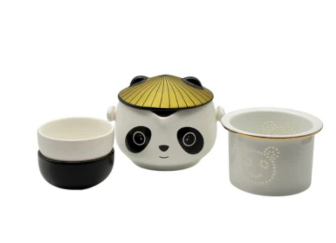 An adorable and convenient travel set for sharing tea anywhere you go. Includes panda teapot 6oz, ceramic tea infuser (brew basket style), 1 black teacup, and 1 white teacup.