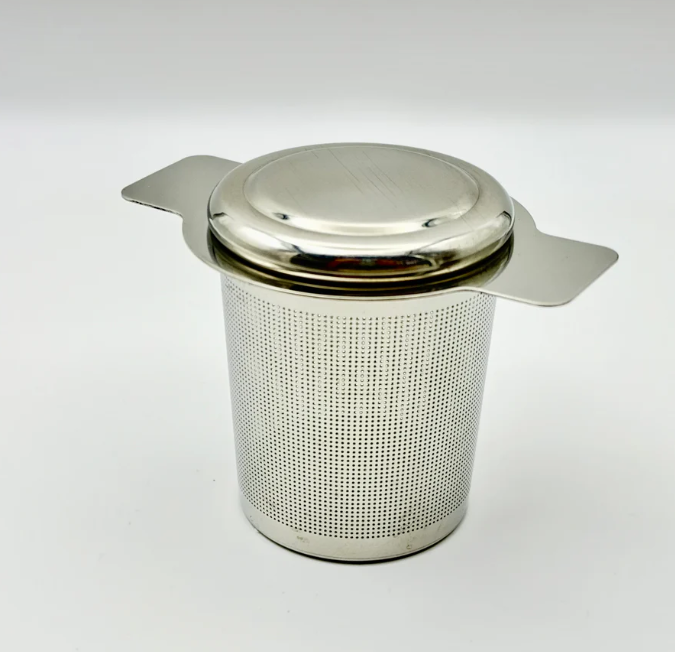 This stainless steel brew basket features a straight-sided design with double handles, ideal for steeping loose leaves in a teapot or mug. The lid helps retain heat during steeping and doubles as a convenient dish for the tea strainer after use.