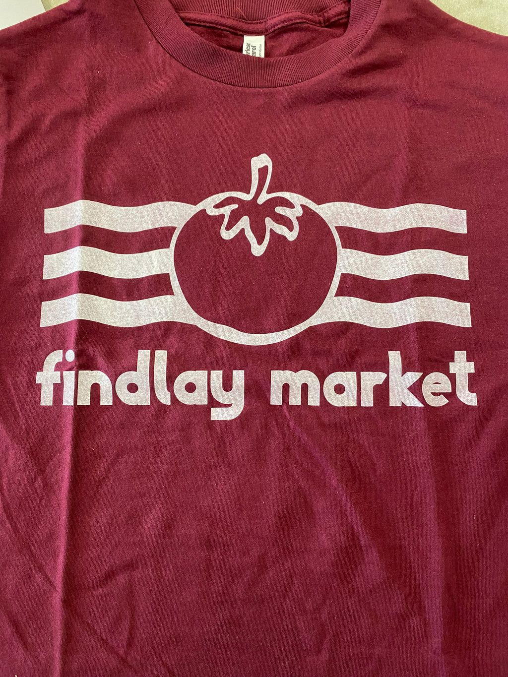 Show everyone how much you support shopping local with Findlay Market's tees. 100% cotton Burgundy crewneck t-shirt with white accents tomato and Findlay Market in a trendy white font.