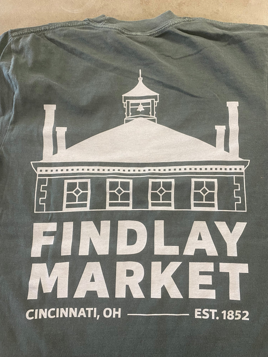 Comfort Colors sage green pocket tee with the Findlay tomato on the pocket. The back of the shirt has the Findlay Market logo.