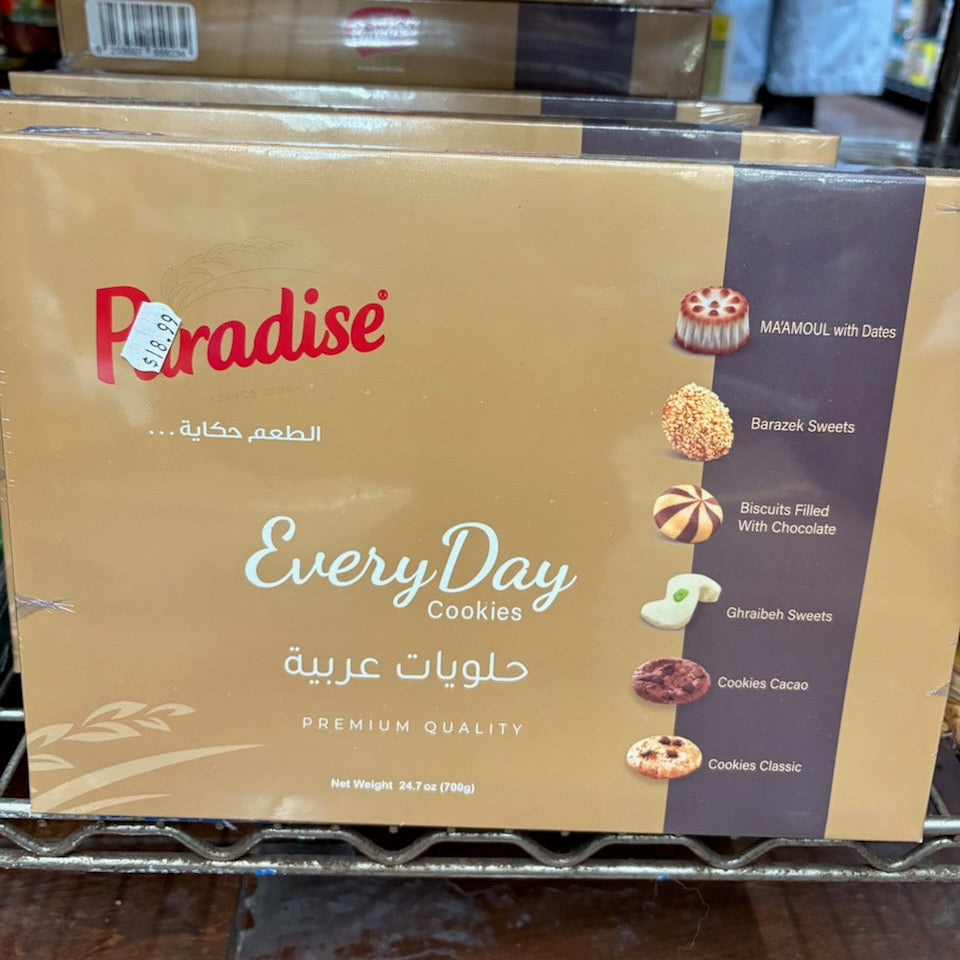 Paradise Everyday Cookies flavors include: MA'AMOUL with Dates, Barazek Sweets, Biscuits Filled with Chocolate, Ghraibeh Sweets, Cookies Cacao, Cookies Classic.
