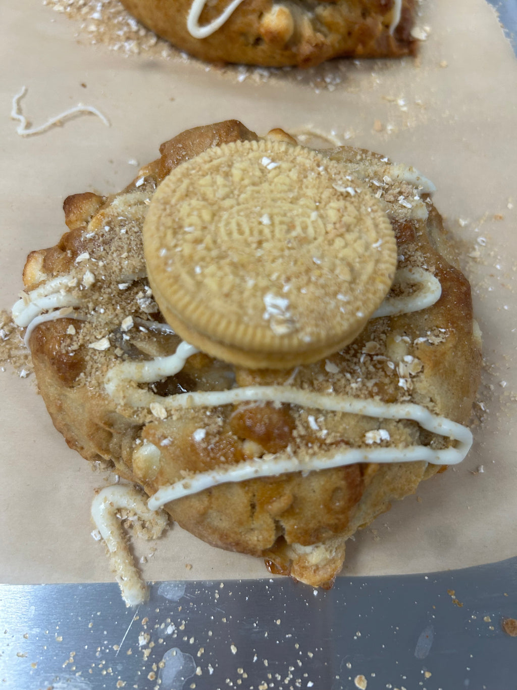 Caramelized apple filling inside of a cinnamon cookie topped with graham crack crumble.