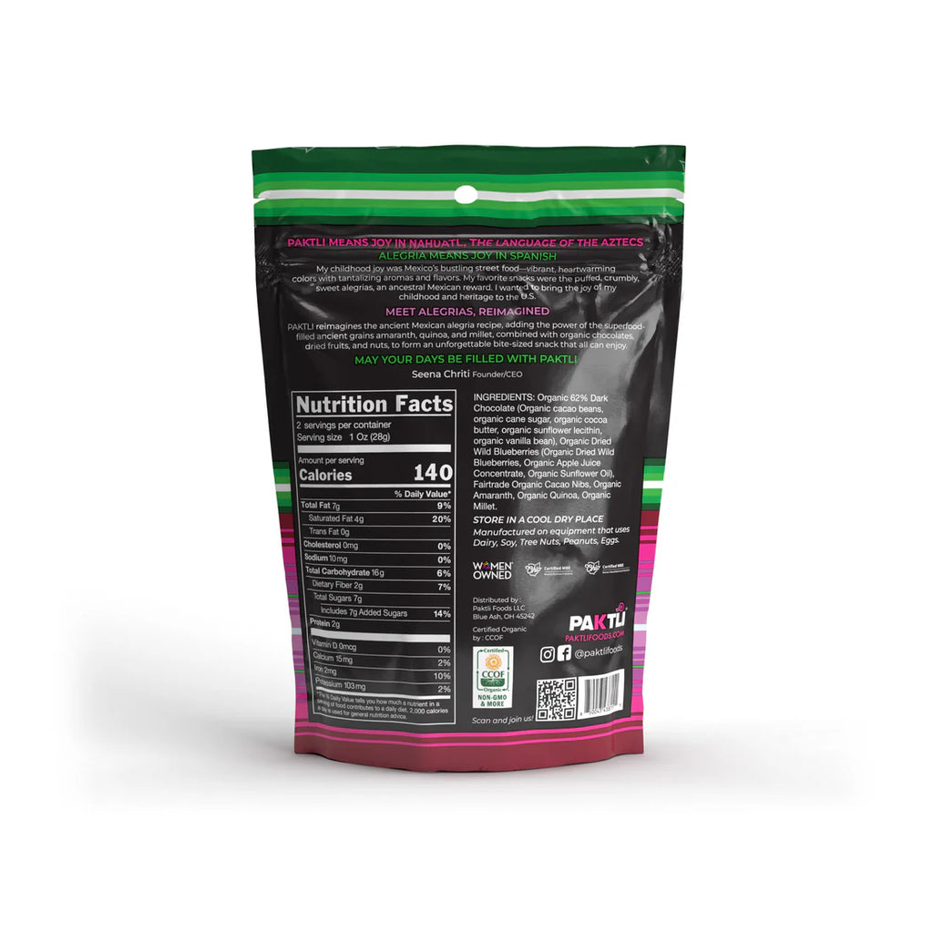 Perfect for Every Occasion: Whether as a mid-day snack, a sweet treat with your coffee, or as a thoughtful gift, our Dark Chocolate Mexican Alegria Bites w/ Blueberries + Cacao Nibs are versatile and suited for any moment. Their elegant packaging and premium quality make it an ideal choice for those who appreciate the finer things in life.