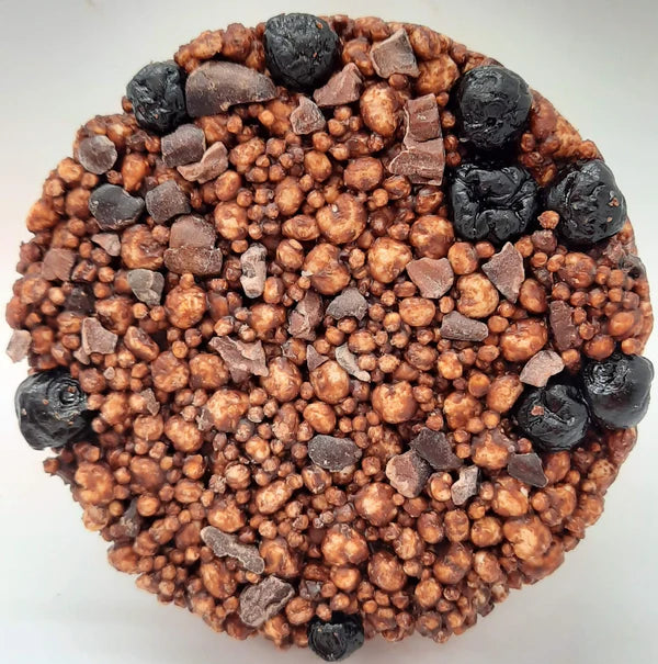 This treat isn't quite what you might expect. It's a balanced bite of rich dark chocolate, light, crumbly, puffed ancient grains, with the added crunch of cacao nibs and dried wild blueberries.