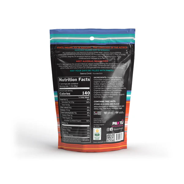 Organic 70% Extra Dark Chocolate (Organic Cacao beans, Organic Cane Sugar, Organic Cocoa Butter, Organic Sunflower Lecithin, Organic Vanilla Bean), Organic Dried Cranberries (Organic dried Cranberries, Organic Apple Juice Concentrate, Organic Sunflower Oil), Organic Cashews, Organic Quinoa, Organic Millet, Organic Amaranth.