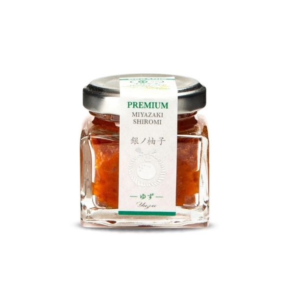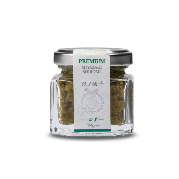 Ingredients: yuzu citrus peel, green chili pepper, salt, water, sorbitol, modified food starch, sake (rice wine), natural and artificial flavor, citric acid, xanthan gum, artificial color (FD&C Blue#1)