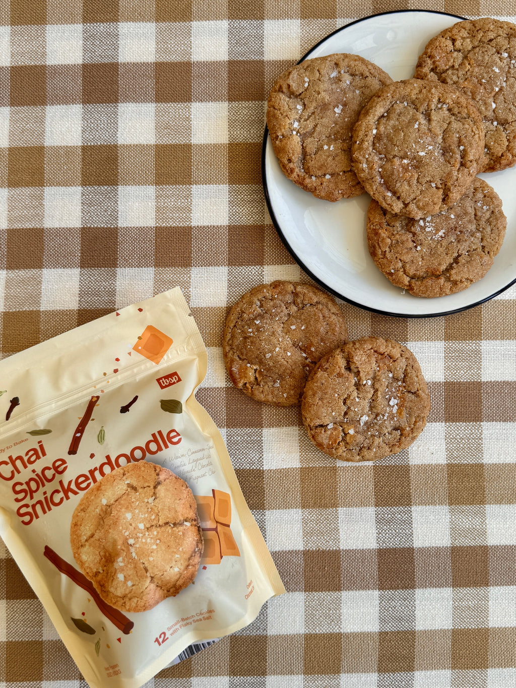 A warm, spiced cookie layered with caramelized white chocolate and fragrant chai. Package comes with 12 frozen cookie dough balls and flaky finishing salt - bake one at a time, or all 12! Easy baking instructions, no clean up!