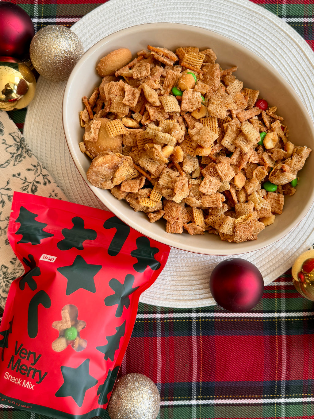Our very popular festive snack mix is back! This snack mix has lots of sweet, sugary, cinnamon bits mixed with slightly salty pretzel sticks topped with holiday candies. Which all come together to make a festive and slightly-addictive mix perfect for holiday snacking and gifting!
