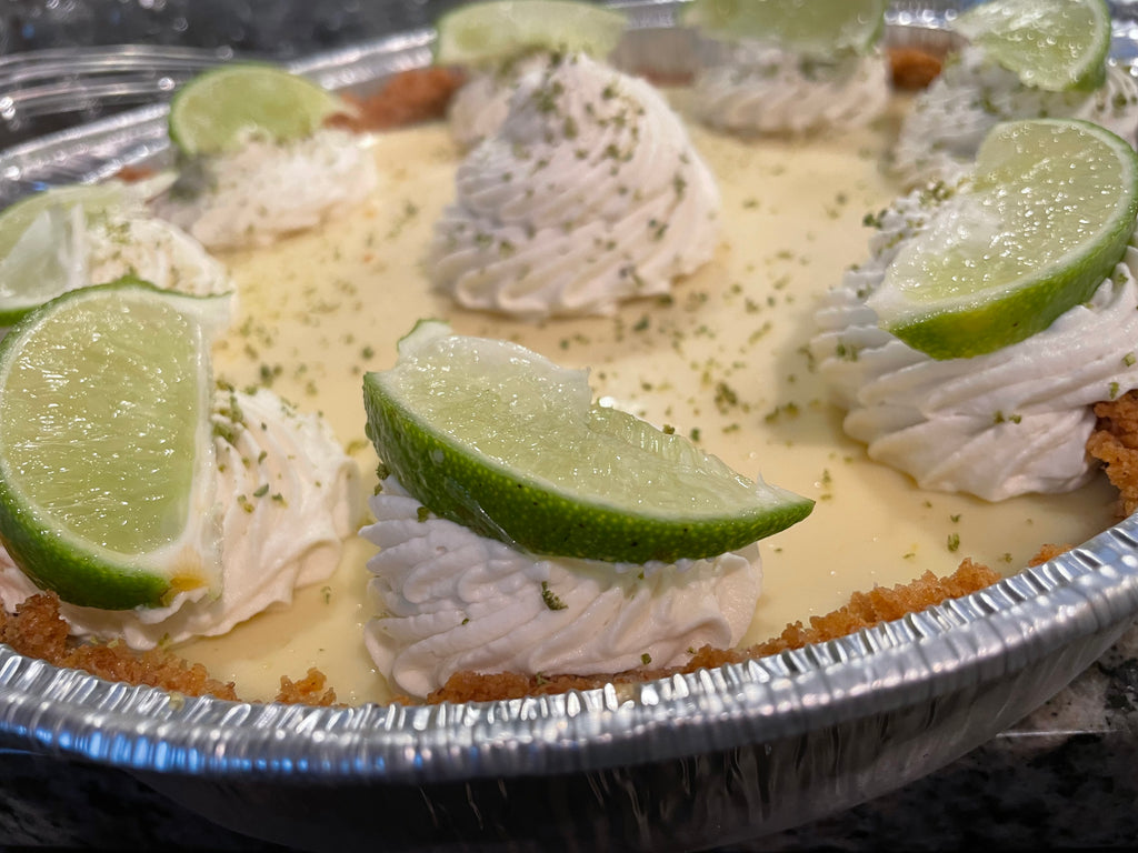 buttery graham cracker crusted filled with lime custard and topped with whipped cream and lime slices